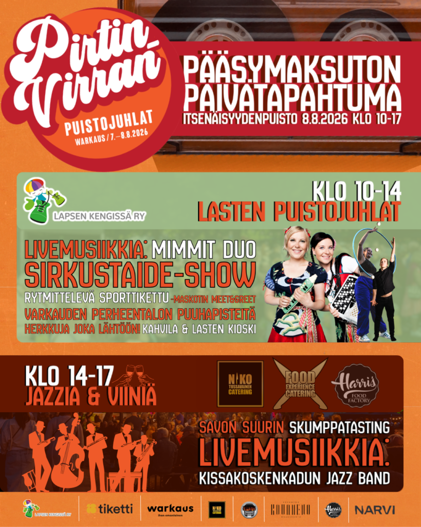 Pirtinvirran puistojuhlat valtaa Varkauden Itsenäisyydenpuiston jälleen 7.-8.2026!